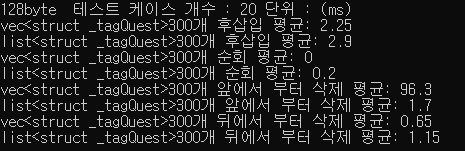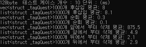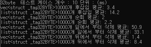 int 10000개 기준으로 앞의 원소를 제거하는 속도는 16byte까지 vector가 우세