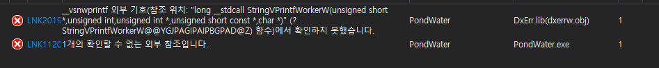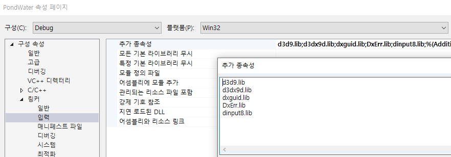 추가종속성은 PondWater 프로젝트 자체에 설정되어있다. 새로운 프로젝트를 생성했다면 d3d9.lib, d3dx9d.lib, winmm.lib 를 기본적으로 넣어주면 된다.