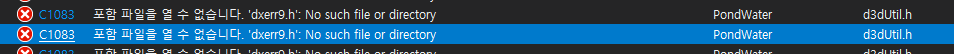 dxerr9.h 헤더를 Dxerr.h 로수정해주고, 링커-입력-추가종속성에서 Dxerr.lib를 포함시킨다.